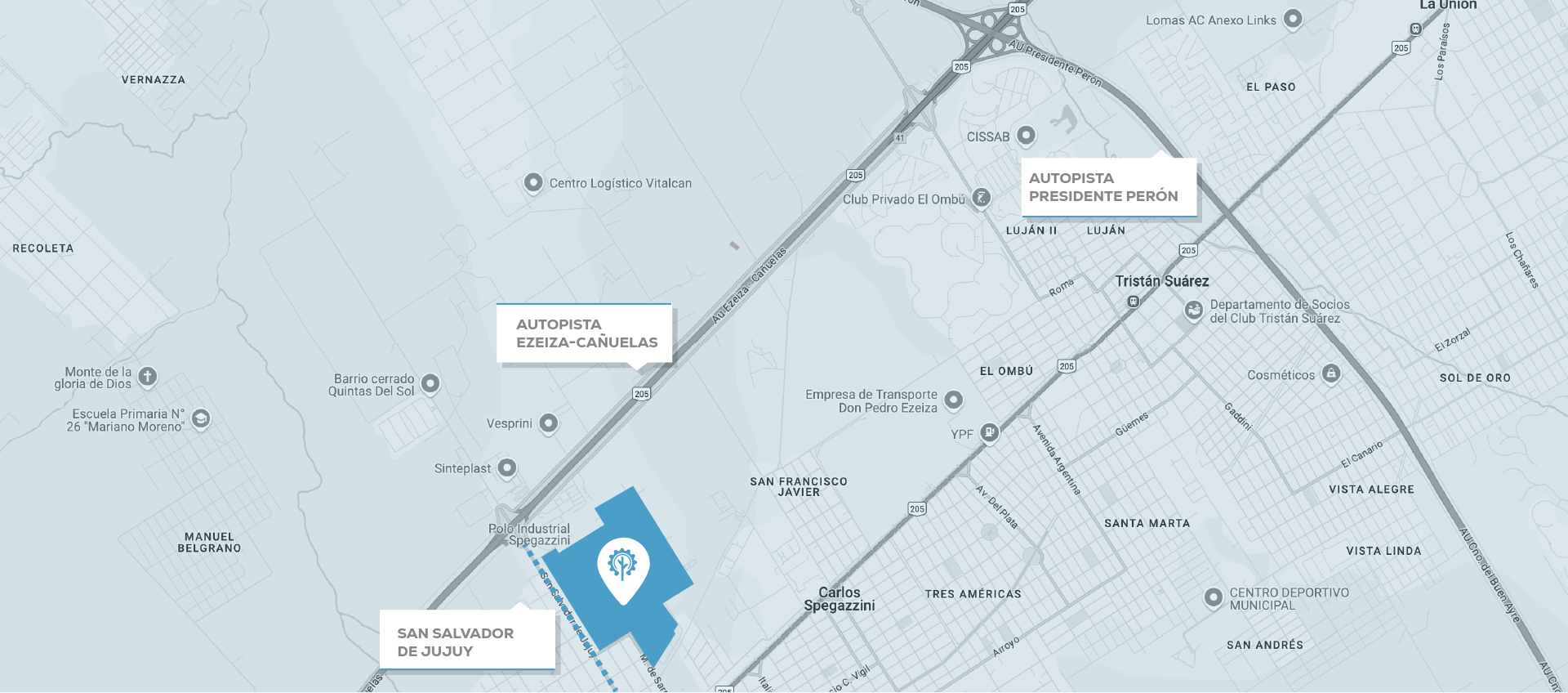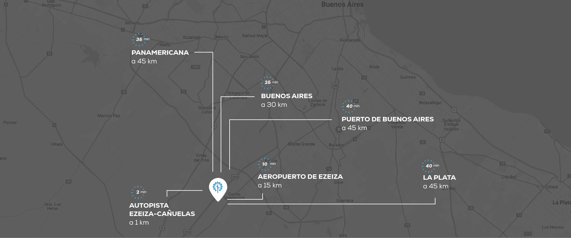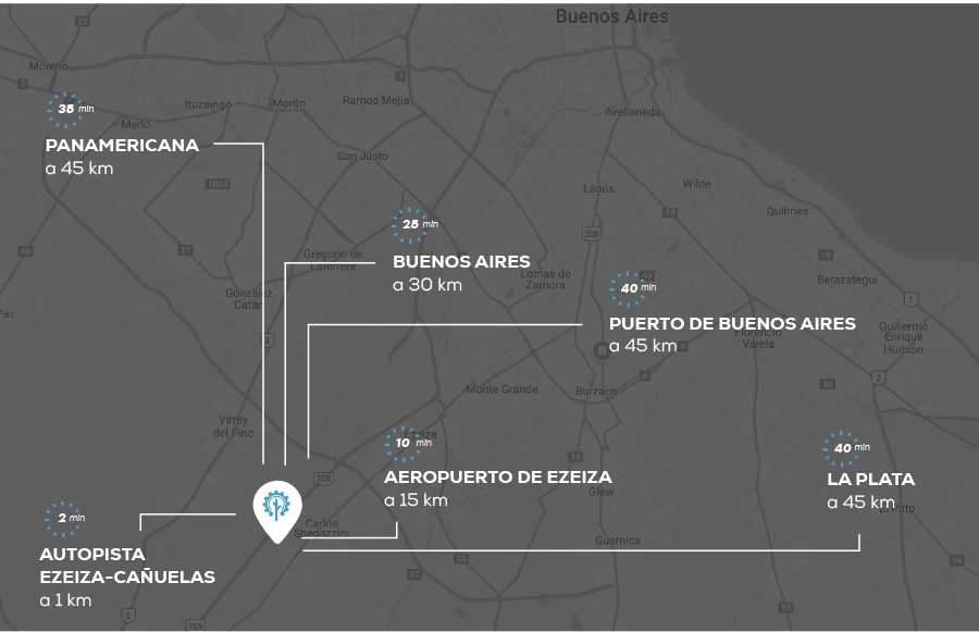 Con acceso directo desde la Autopista Ezeiza-Cañuelas, el parque se conecta de forma rápida con CABA, el aeropuerto y los principales corredores logísticos.